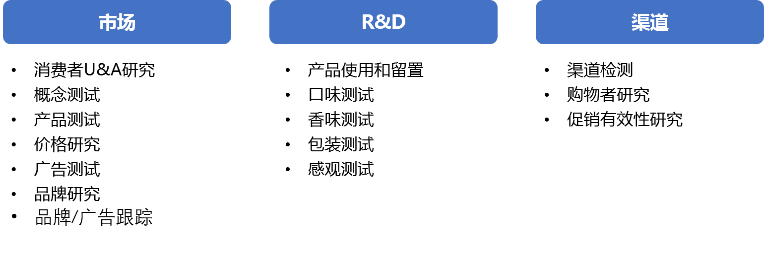 消費(fèi)品(快消品)研究包含可行性研究、消費(fèi)者U&A研究、概念測(cè)試、市場(chǎng)細(xì)分研究、產(chǎn)品測(cè)試、新產(chǎn)品創(chuàng)新開發(fā)、品牌研究及品牌定位、品牌評(píng)估與傳播、廣告及活動(dòng)效果評(píng)估、服務(wù)滿意度研究、渠道監(jiān)測(cè)等等。華夏經(jīng)緯研究團(tuán)隊(duì)提供新產(chǎn)品從機(jī)會(huì)識(shí)別到上市、量產(chǎn)及升級(jí)的全流程服務(wù)。