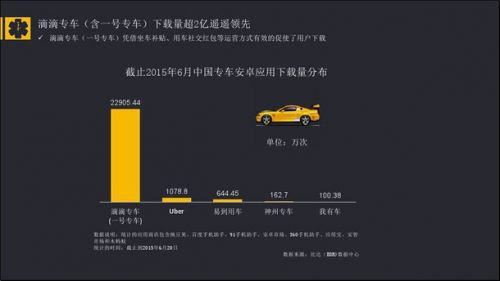報告顯示,截止到2015年6月中國專車安卓應用市場,滴滴打車(含一號專車)安卓應用市場的下載量為22905.44萬次,Uber、易到用車、神州專車等專車應用,分別以1078.8萬次、644.45萬次、162.7萬次分列行業二、三、四位。