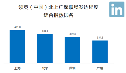 作為參考,領英在本次報告中也對北京、上海、廣州、深圳四個一線城市做了分析。在我們所列出來的五個評價指標中,上海分別在“職業(yè)社交用戶數(shù)量”、“職業(yè)社交活躍度”、“海外受教育比例”以及“職業(yè)檔案完整程度”四個指標中排名第一,當之無愧地成為中國職場發(fā)展程度最高的城市。