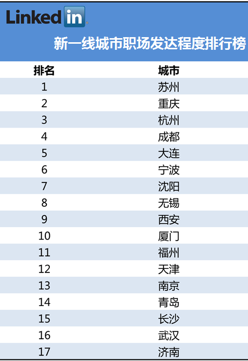 近日,有機構對國內排名靠前的新一線城市的幸福感程度進行排名和分級,衡量標準除了有京東、去哪兒、滴滴打車等消費、旅游、交通在內的生活類應用,還將領英(LinkedIn)作為各城市職場發(fā)展水平的重要衡量標準。為了完整反映國內新一線城市職場發(fā)展水平,領英對國內17座新一線城市的職場社交狀態(tài)做了深度的數(shù)據(jù)挖掘、分析與解讀,并發(fā)布了這份《中國新一線城市職場發(fā)達程度報告》。