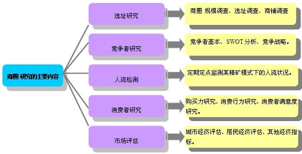 商圈是一個地理概念。從行業角度講,不同業種和業態零售業者在一個相對集中的區域從事經營活動,這個區域的范圍就叫商圈。從零售業者的角度講,商圈即指店鋪能夠有效吸引顧客來店的地理區域。商圈研究是運用科學的市場調研方法,通過調查分析商圈的商業生態構成、影響范圍、商業特點以及影響等因素,為選擇商業營業或制定營銷策略提供科學依據。